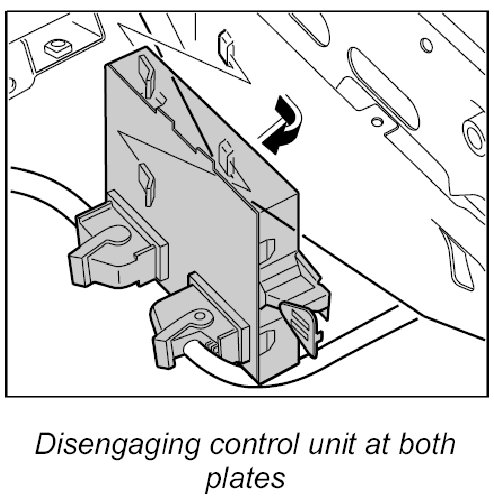 3. Push control unit forward in "direction of travel" and disengage it from the support for the steering wiring.
