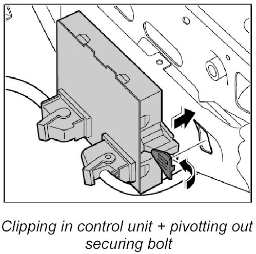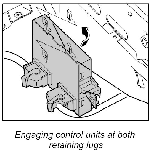 2. Engage control unit in support for wiring harness with both retaining lugs.