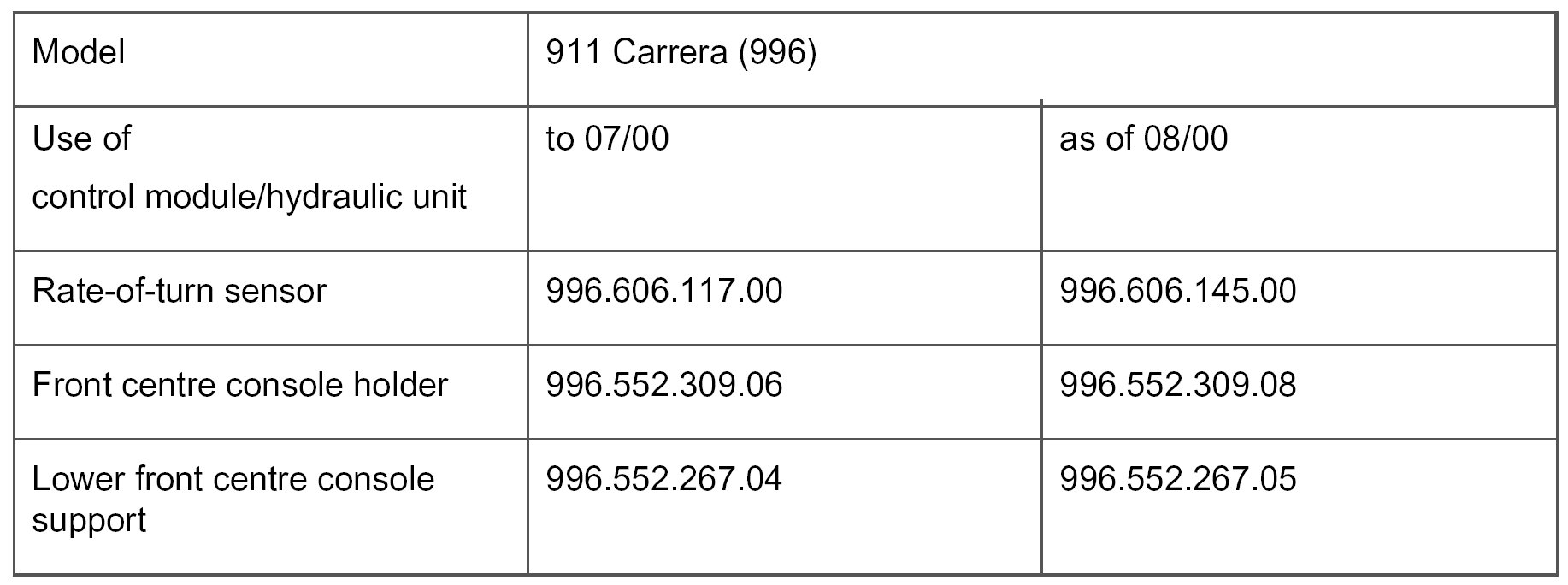 NOTE: Observe the allocation to the rate-of-turn sensor: The control module as of 08/00 performs a self-test of the rate-of-turn sensor. This control module must be installed only in combination with the rate-of-turn sensor with part No. 996.606.145.00.