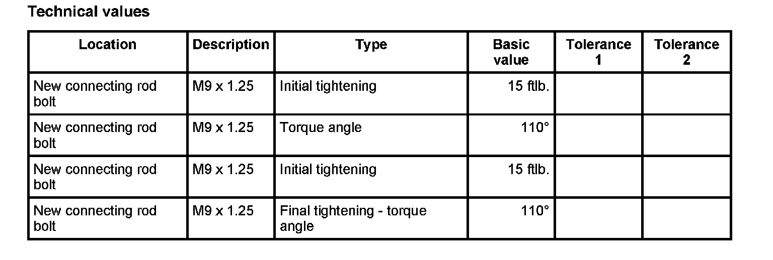 4. Pre-tighten connecting rod bolts to the specified torque and perform the final tightening with a torque angle wrench. -> Initial tightening: 15 ftlb.; -> Final tightening - torque angle: 110°