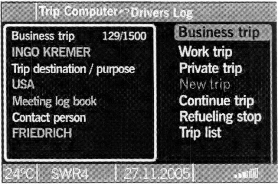 The PCM2.1 logbook supports the driver in maintaining a logbook by recording all relevant data for the type of trip (private, business), much of it automatically, and reducing user input to a minimum. PCM2.1 automatically records every trip > 60 miles/100 kilometers. Trip recording starts as soon as the key is instead into the ignition and ends when it is removed. PCM2.1 will automatically record the following data: