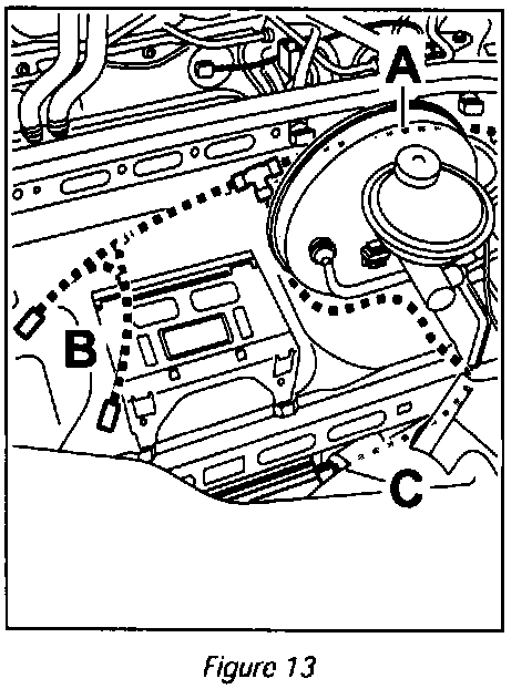 Route optical waveguide from optical waveguide connection point -> Figure 13 -A- along the front panel to the navigation unit installation position -> Figure 13 -B- and possibly to the amplifier -> Figure 13 -C- or CD changer and secure at this position.