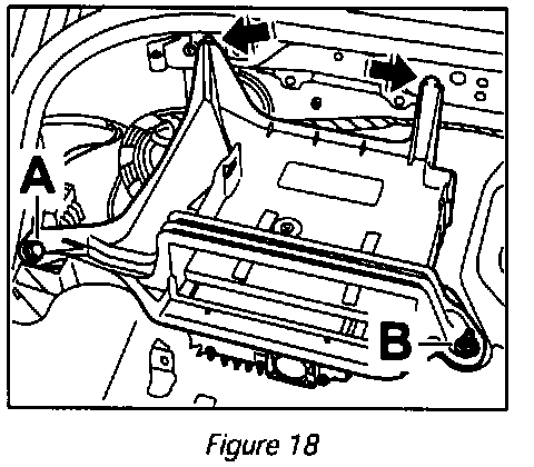 8.2.2 Press in combination holder for amplifier/navigation unit (997.645.351.00) with the two fastening parts -> Figure -18- Arrows- on the body and tighten screw (900.078.179.09) -> Figure 18 -A- and nut (900.377.018.09) -> Figure 18 -B-.