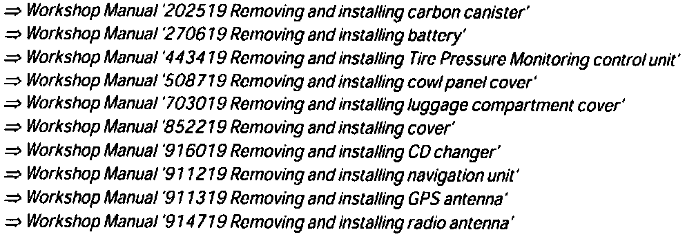 2. Install GPS antenna. -> Workshop Manual '911319 Removing and installing GPS antenna.