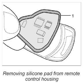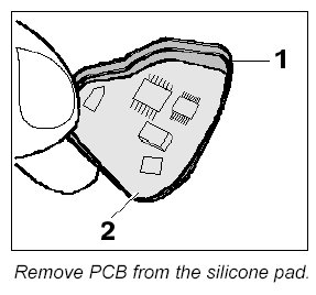 2. Remove silicone pad -1- with PCB from the remote control housing.