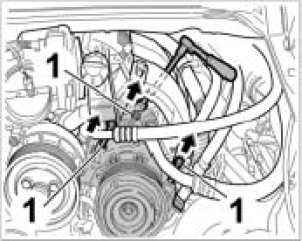 6. Place the air-conditioning compressor with the rear fastening screw on the engine housing and screw down with the three fastening screws -1-. M8 17 ftlb.