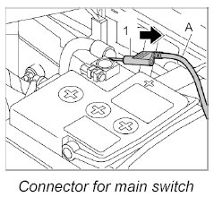 1. Pull off the B+ plug -1- for the main switch (battery disconnect switch) from the battery positive terminal.