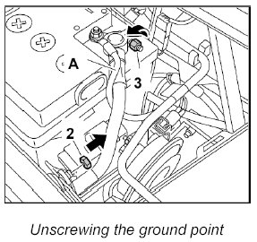 2. Unscrew the fastening nut -2- for the ground point on the body and disconnect the negative terminal -3- from the battery.
