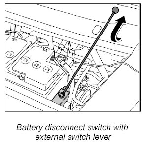 The battery disconnect switch, which is supplied via the positive terminal, is closed manually using the external switch lever and locked electromagnetically. The luggage compartment lid must not be open when doing this.
