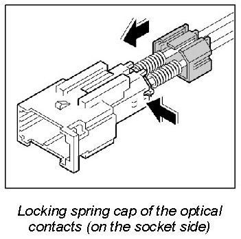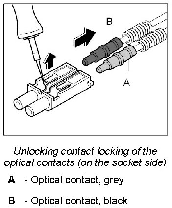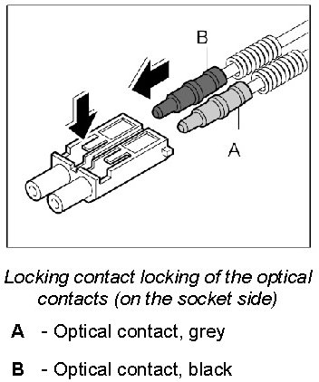 The LWL is delivered with affixed plastic contacts. These contacts are latched in the connector housing in the case of repairs. Grey and black contacts with identical mechanical dimensions are used.