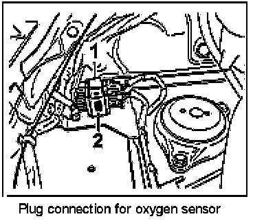 1. Disconnect plug connection in right of engine compartment for the oxygen sensor behind catalytic converter. To do this, first remove the grey connector from the holder and pull the red locking element upwards. Disconnect cable plug.