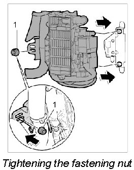 1. Engage the fusebox on the support and secure with the fastening nut -1-. Ensure that the electrical lines are not trapped or installed live. - Tightening torque: 9.7 Nm (7 ftlb.)