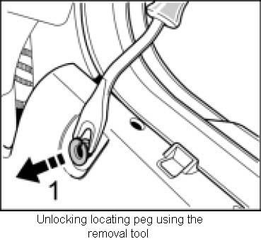 3. Unlock locating peg -1- of the support using the commercially available removal tool Disassembly tool, universal NR.21.