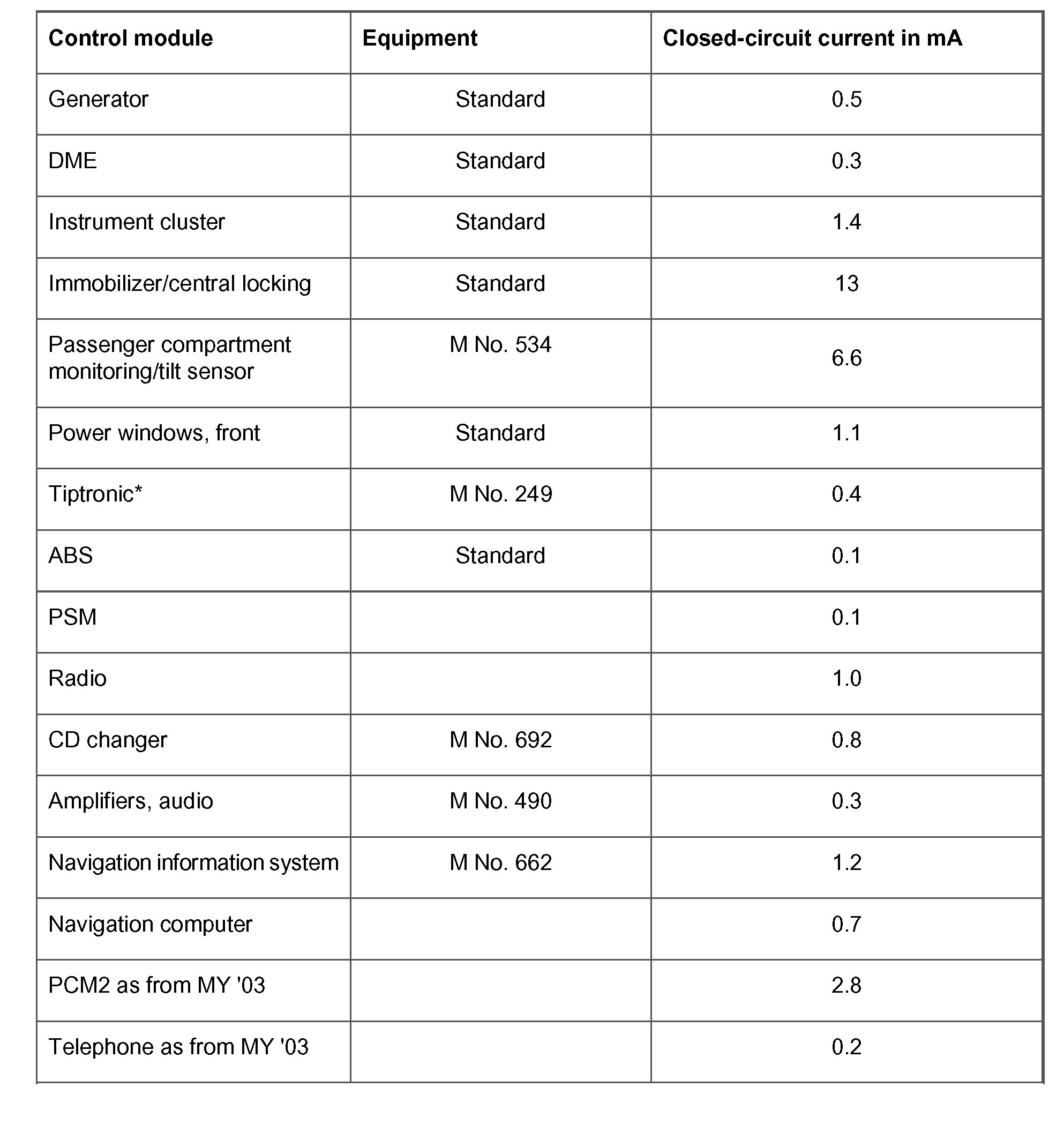 NOTE: Before measuring the closed-circuit current, determine the vehicle equipment (M-numbers) and establish the expected closed-circuit current with the aid of the attached table.