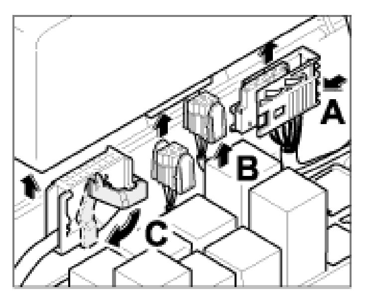 4. Remove control unit, disengage the connector housing -A- to the right, and pull it down and off. Press plug connection -arrow B- together and pull it down and off. Disengage plug connection -arrow C- upward and to the right, and pull it down and off.