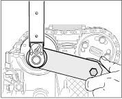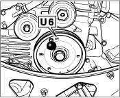 1. In order to remove the play from the control chain drive, turn the engine at the belt pulley of the crankshaft clockwise (engine direction of rotation) to 60° before TDC (identification U6 on the belt pulley is flush with the fixing bore in the crankcase). Fix with the special tool fixing pins as of mod. 98 9595/1. Use short fixing pin.