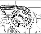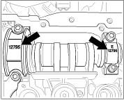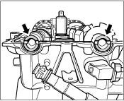 1. Align camshafts. On both camshafts, the smaller circular cutouts must lie at the top -arrows-. If necessary, shift the camshafts slightly.