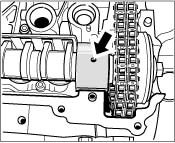 5. Insert inlet camshaft 4-6. If necessary, pre-assemble the inlet camshaft. Pull the control chain out of the chain housing of the cylinder head with a welding wire and position on the toothed ring of the camshaft adjuster, at the same time inserting the camshaft at overlapping TDC of cylinder 4 (the cams of cylinder 4 point towards the bulkhead of the flat-base tappet housing -arrows- ).