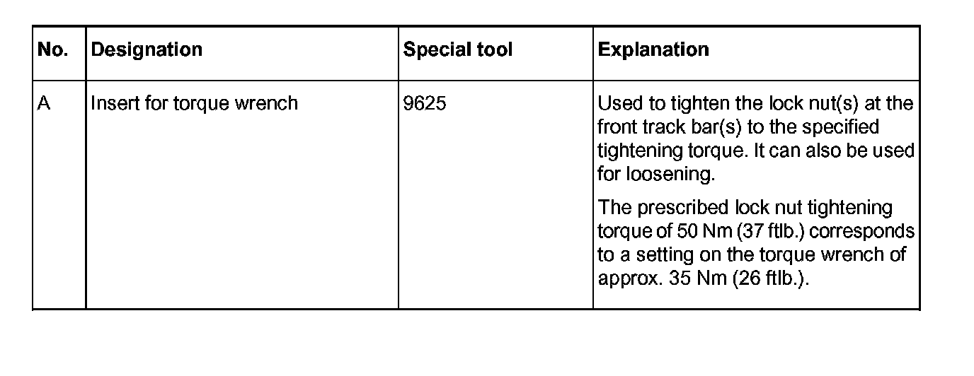 In order to tighten the tie rod lock nut(s) - to the prescribed tightening torque - use special tool 9625 in conjunction with a torque wrench (Figure 7_97). The prescribed lock nut tightening torque of 50 Nm (37 ft. lbs.) corresponds to a setting on the torque wrench of approximately 35 Nm (26 ft. lbs.).
