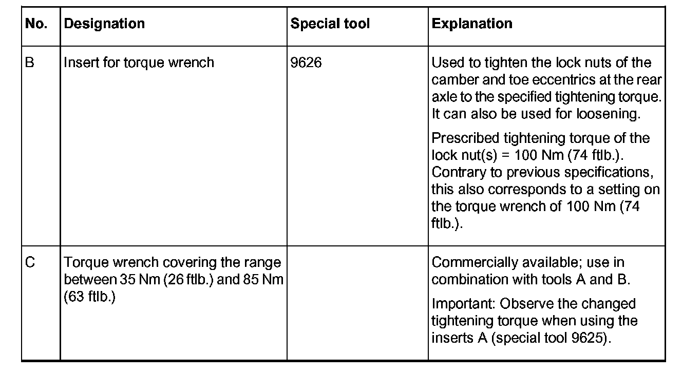 ^ Use special tool 9626 in combination with a torque wrench to loosen and tighten the lock nuts of the toe and camber eccentrics. The prescribed lock nut tightening torque of 100 Nm (74 ft. lbs.) also corresponds to a setting on the torque wrench of approximately 100 Nm (74 ft. lbs.).