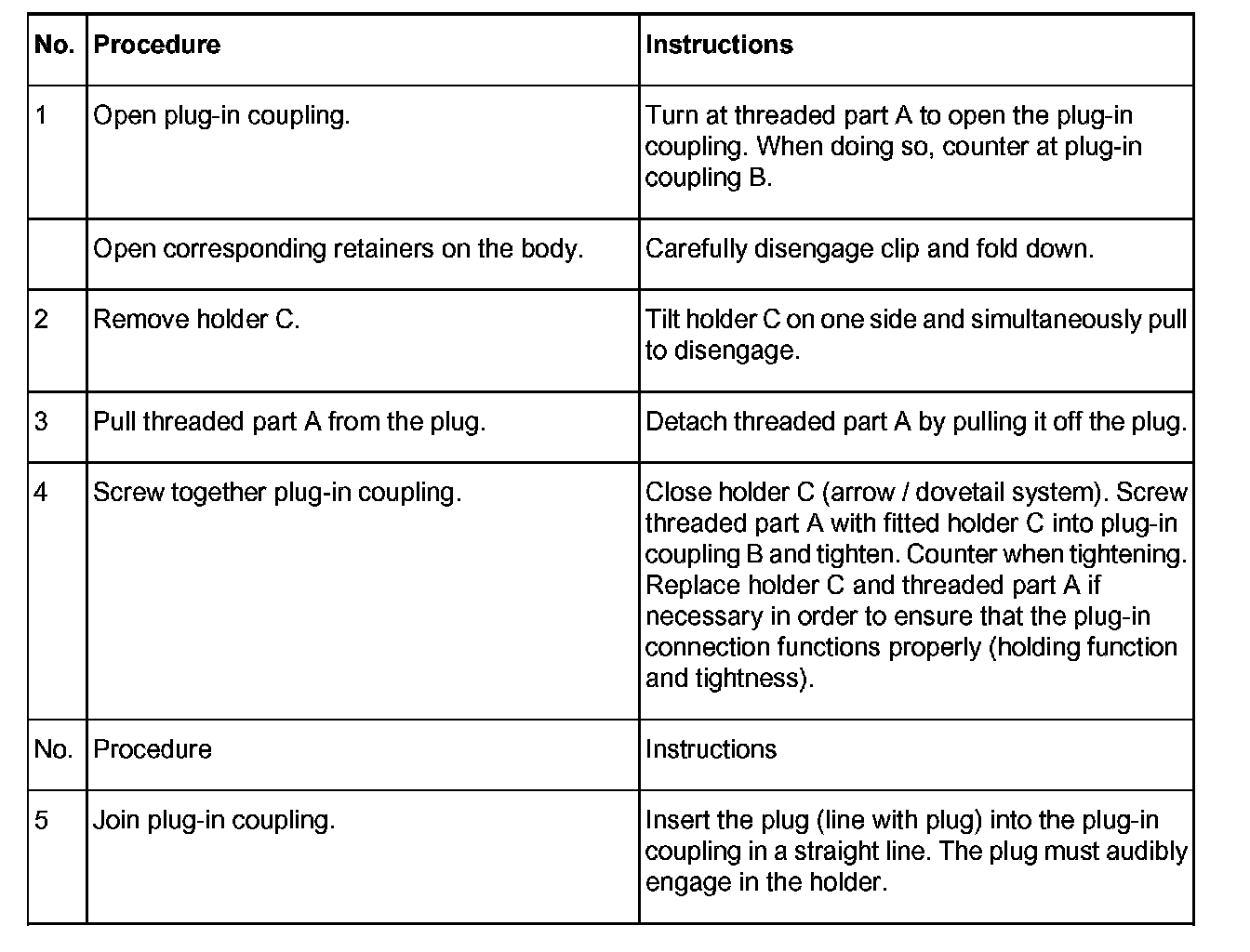 Perform preparations carefully when handling plug-in couplings - e.g. cleaning and fitting the plugs - as repairs are possible only by replacing the affected line in most cases. Only the threaded part A (with fitted O-rings) and the holder C are available as individual parts for the plug-in coupling.