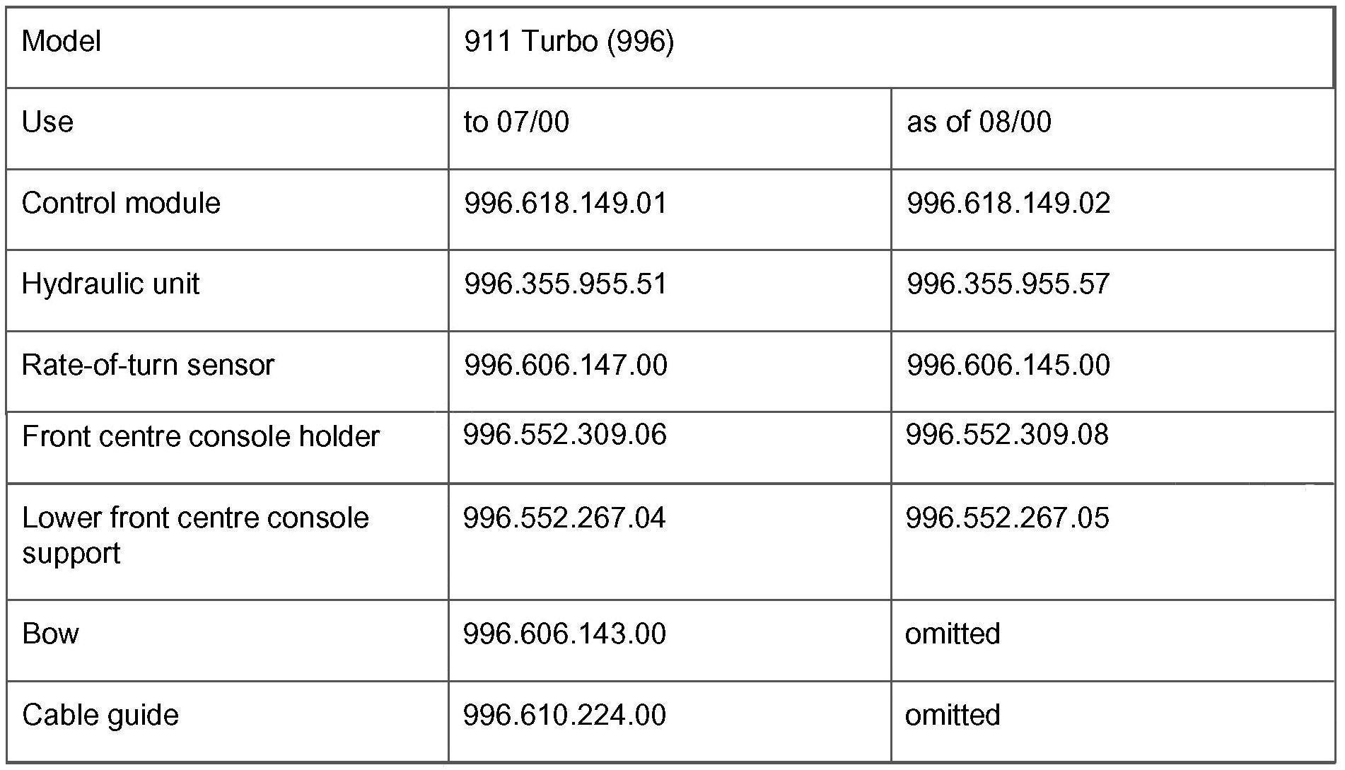 NOTE: Observe the allocation to the rate-of-turn sensor: The control module with part No. 996.618.149.02 performs a self-test of the rate-of-turn sensor. This control module must be installed only in combination with the rate-of-turn sensor with part No. 996.606.145.00. The allocation is listed in the table below.