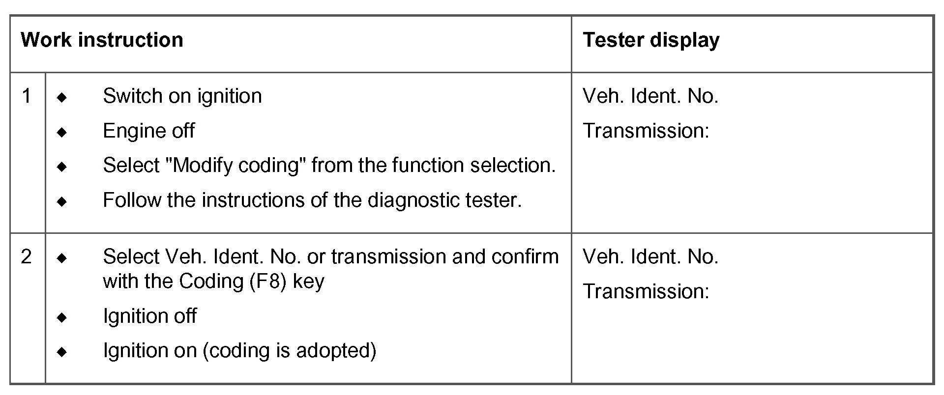 - The control module must be coded for the corresponding type of transmission (manual transmission/Tiptronic).