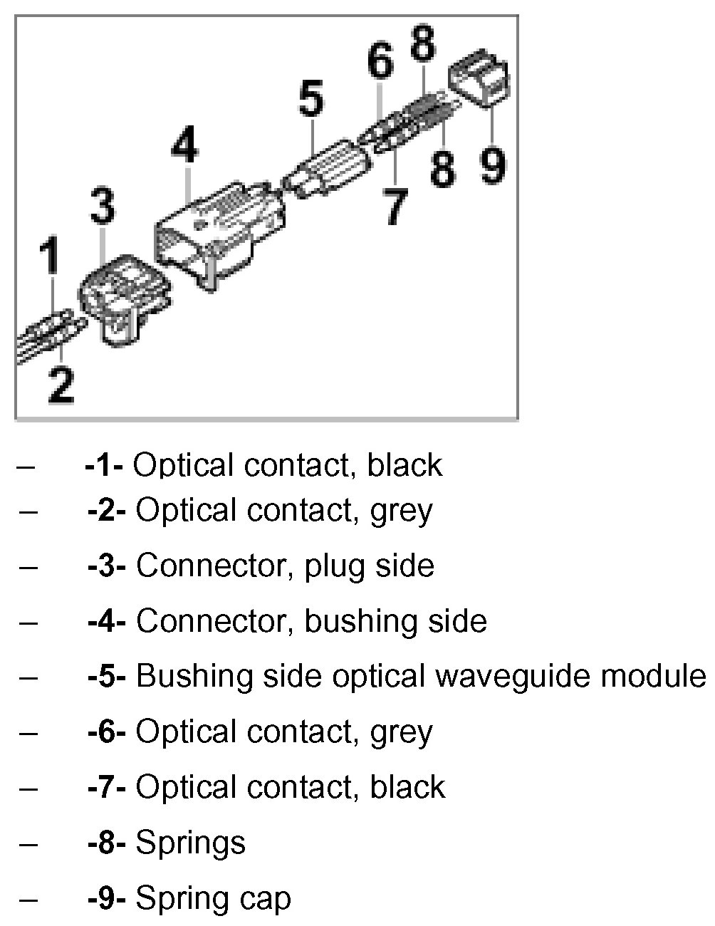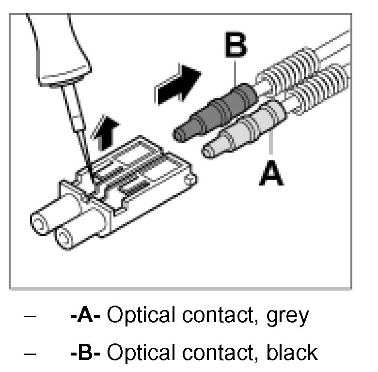 The optical waveguide is delivered with plastic contacts affixed. In case of repairs, these contacts are engaged in the connector housing. Grey and black contacts with identical mechanical dimensions are used.