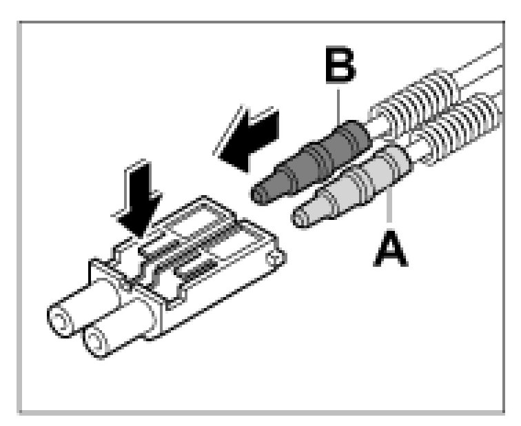 1. Push the optical contacts -B- and -A- into the module until they engage perceptibly. Check for proper seating of the optical contacts.