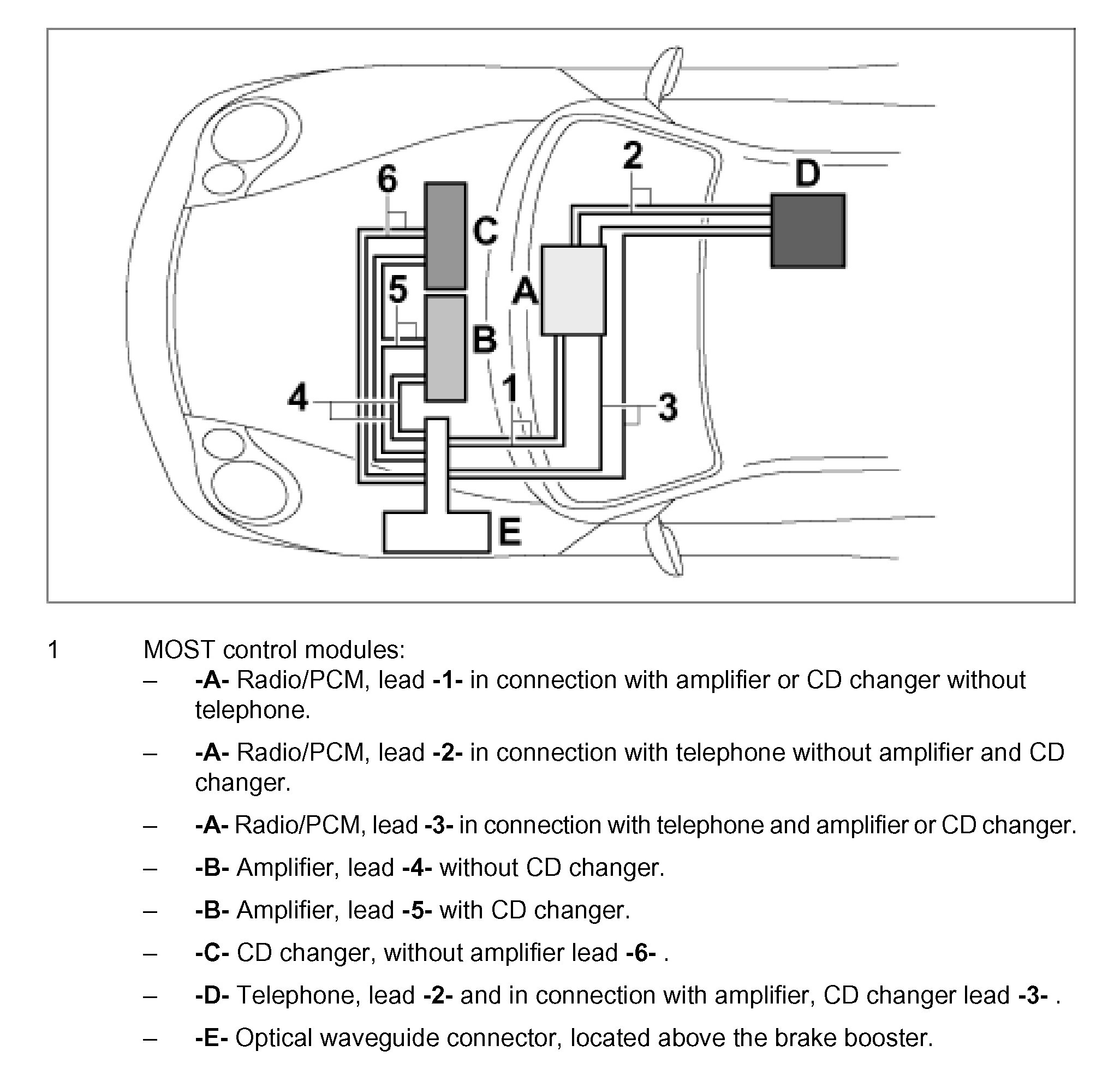 The graphic below shows the wiring of the individual MOST control modules which varies according to the particular equipment.