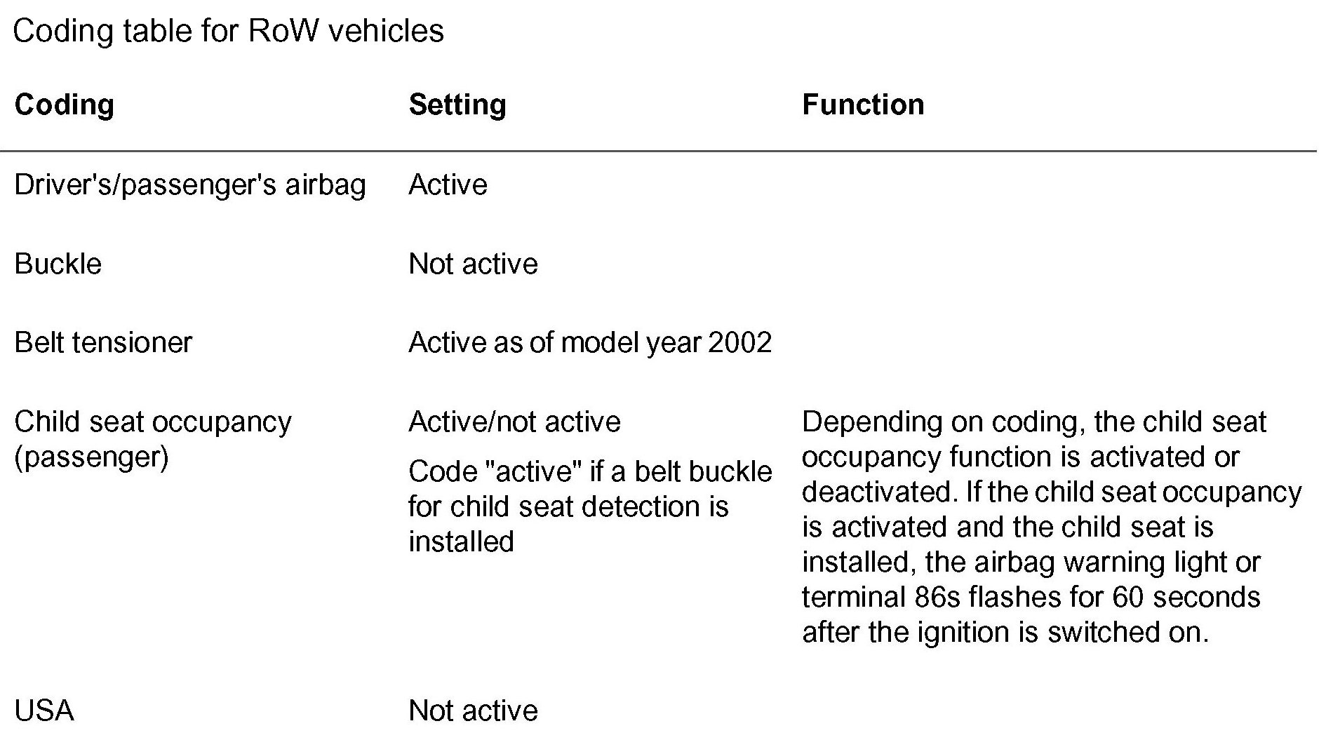 Coding table for USA vehicles