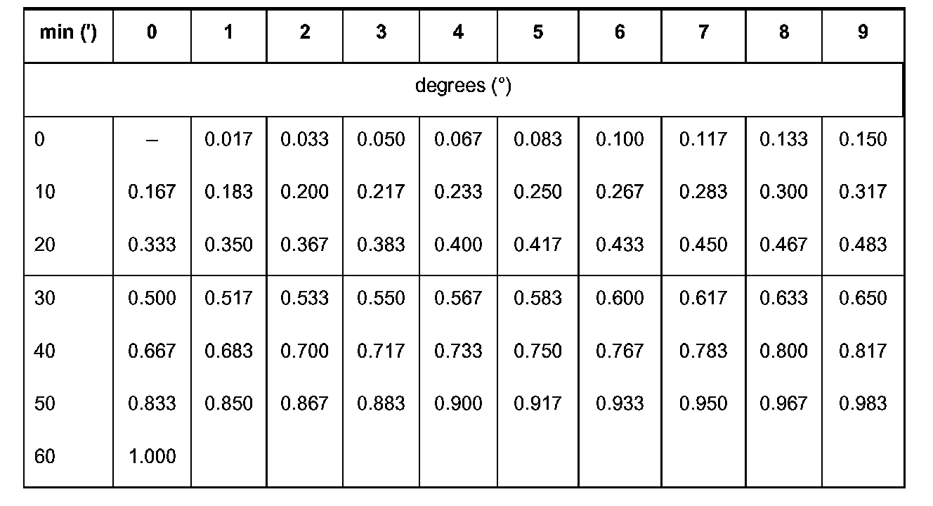^ Example 1: Toe 17 min (17') = 0.283 decimal degrees according to table. Procedure for this: The imaginary line starting at the top of the 7 mins column moving downwards and the line starting on the left in the 10 mins row moving right meet at point/column 0.283.