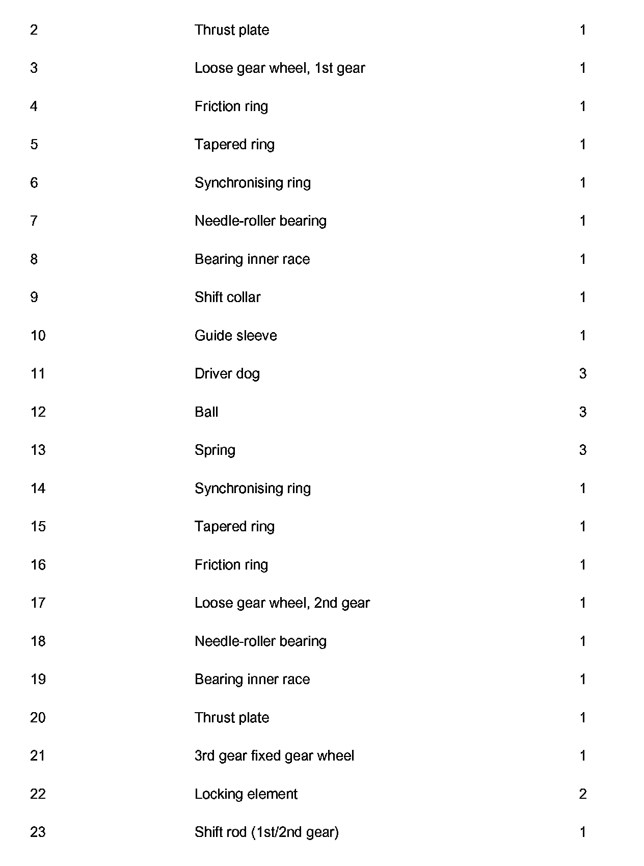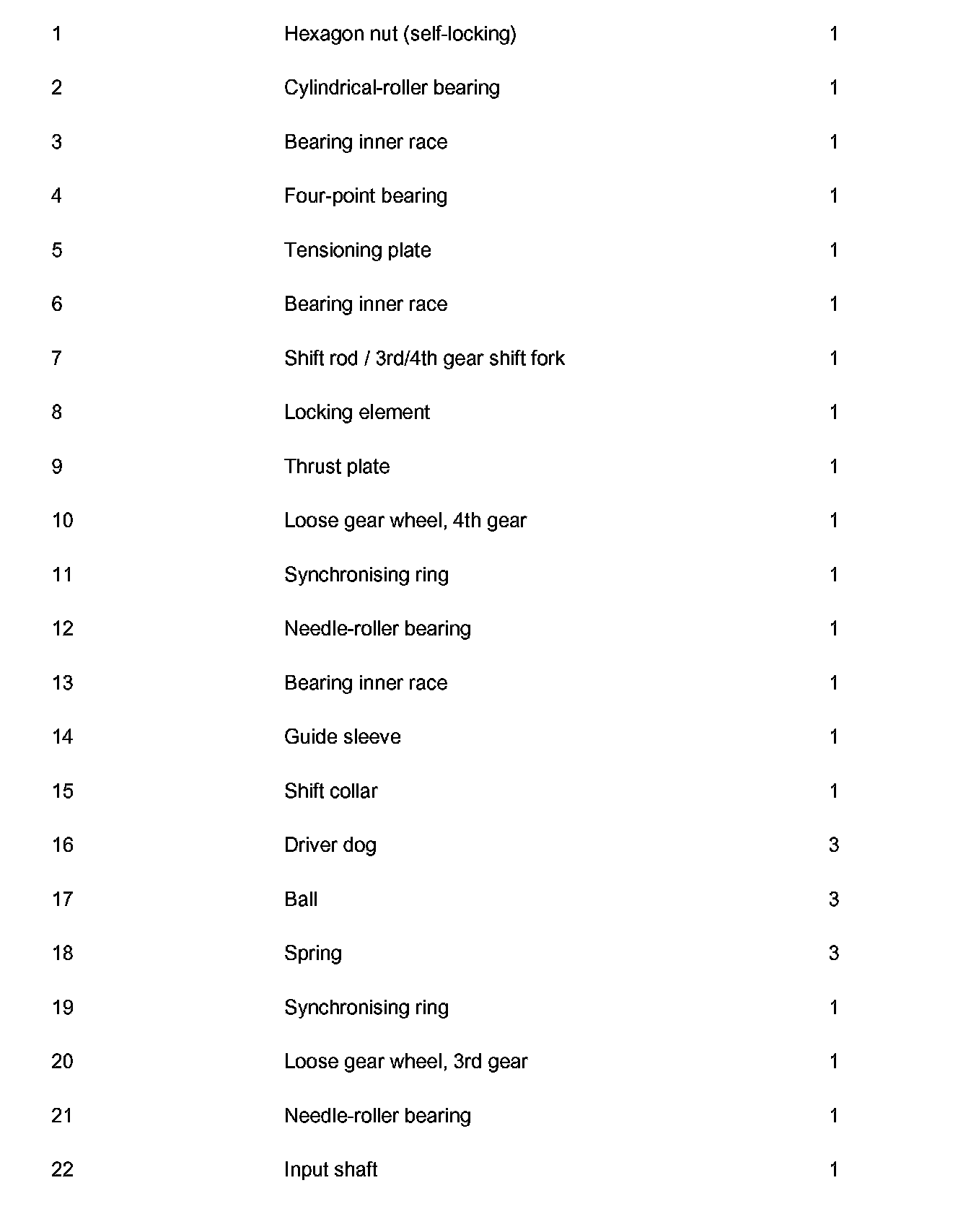 5. Pull loose gearwheel for 1st gear (no. 3 in overview) off the input shaft with the thrust plate (no. 2 in overview) and cylindrical-roller bearing (no. 1 in overview).