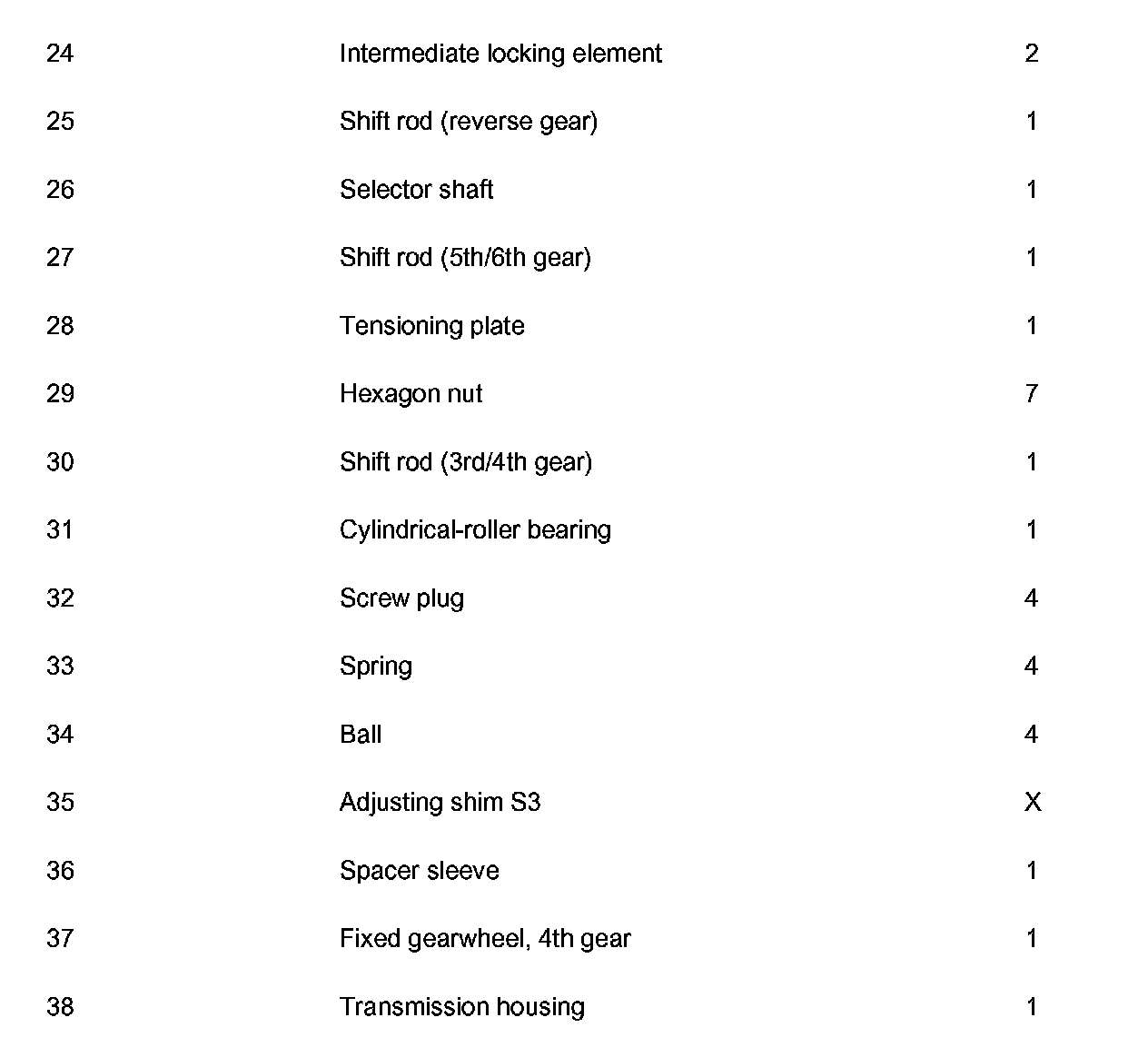 2. Pull out reverse gear shift rod (no. 25 in overview) and shift rods for 5th/6th gear (no. 27 in overview) towards the front. Pay attention to the intermediate lock (no. 24 in overview) and locking elements (no. 22 in overview) during this procedure.