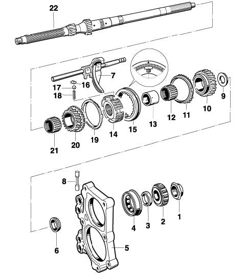 11. Remove loose gearwheel, 5th gear (no. 17 in overview) with needle-roller bearing (no. 19 in overview).