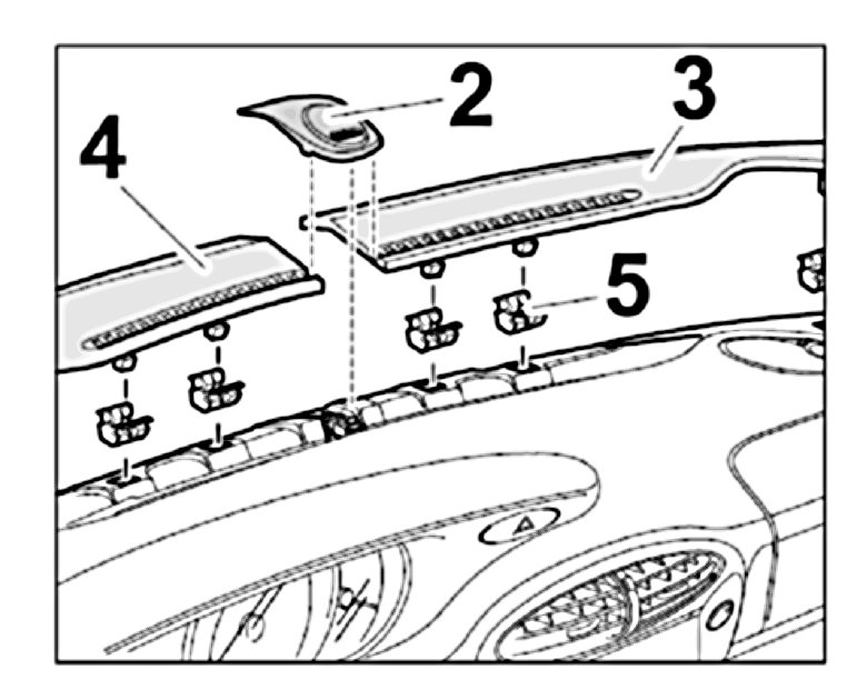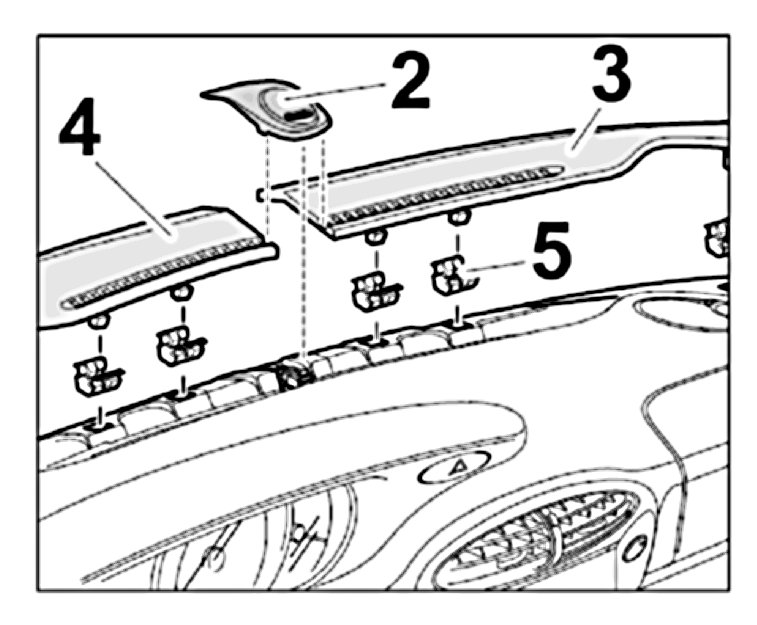 2.1. Check the fastening clips -5-, replace if necessary. Insert the defroster covers left and right -3 and 4- and clip in under the alarm readiness lug. Clip in alarm readiness light -2-.