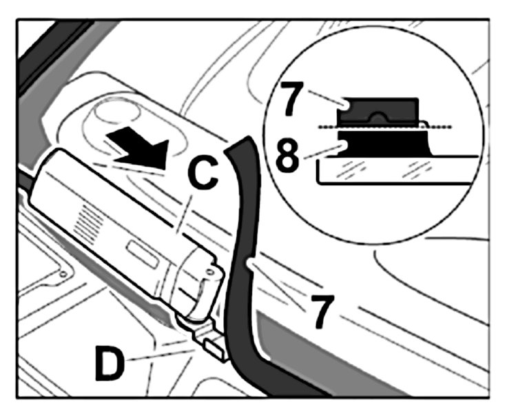1.1. When removing remaining adhesive -7- with the cutting tool -C- and the flashing knife -D- on the body, ensure that a surface coating of adhesive remains -8-.