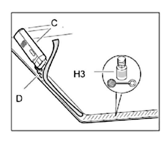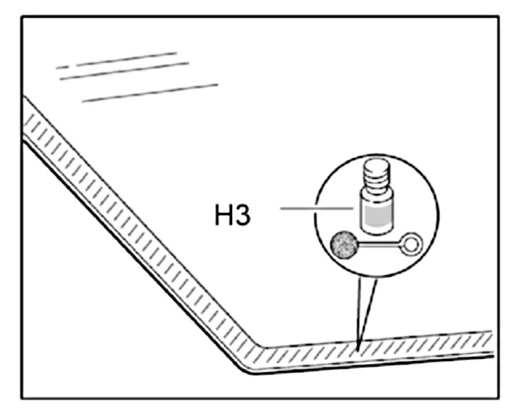 2.1. Clean new paint areas or damage to the top coat paint in the non-visible area of the glass section in the body with cleaning solution -H1- and patch with primer -H2-.