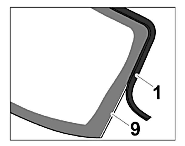 2.1. Place surrounding section -9- on the windscreen and press cover section -1- into the groove of the surrounding section.