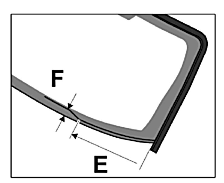 3.1. Before applying the adhesive material, mark the course of the adhesive bead in accordance with the dimensions -E- = 160 mm, -F- = 30 mm on the left and right on the lower edge of the windscreen.