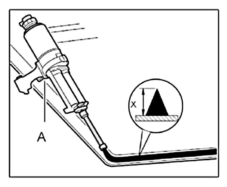 4.1. Apply 2-component bonding material with the adhesive gun -A- to the windscreen along the cover section as a triangular bead measuring -X = approx. 15 mm-.