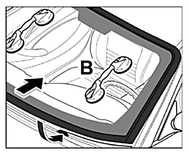 5.1. Apply suction cups -B- to the windscreen and insert the windscreen into the window aperture. Press the windscreen up as far as it will go. When doing so, press the lower edge of the glass against the spacer blocks.