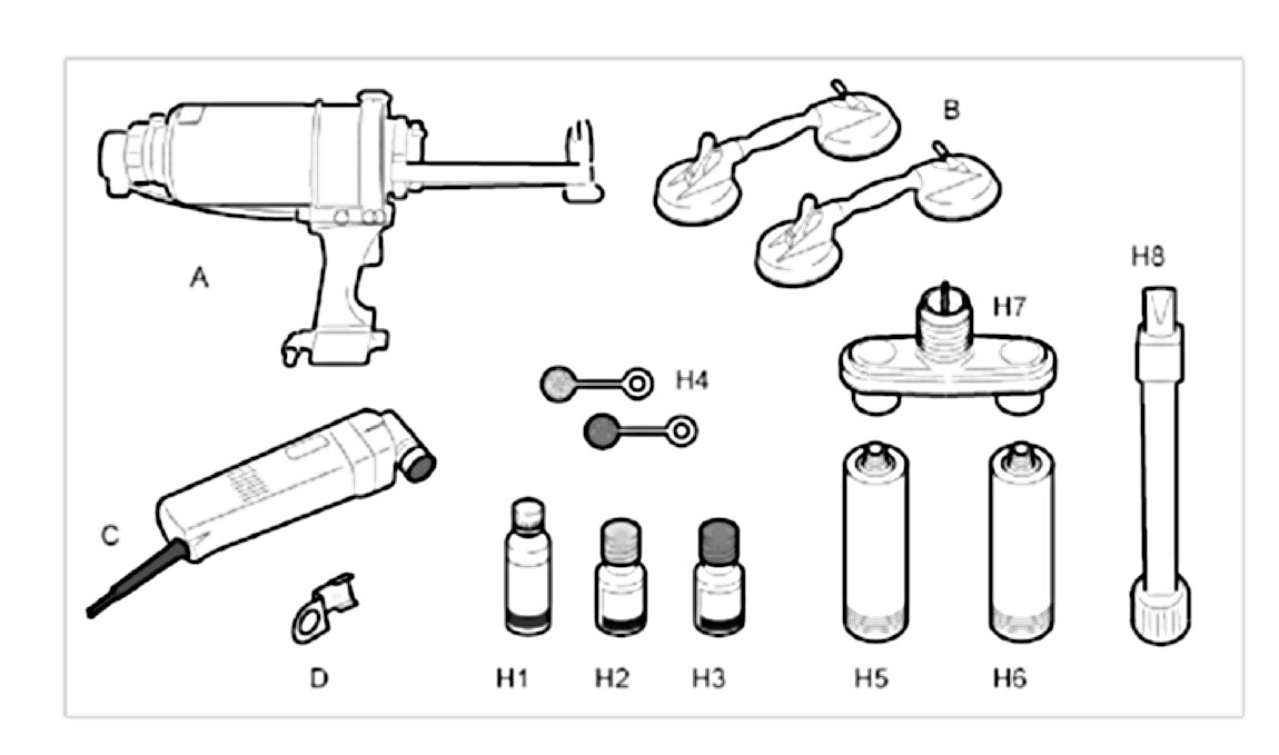 1.1. Equip cutting device -C- with the flashing knife -D- and remove the remaining adhesive from the windscreen, ensuring that a surface coating of adhesive remains.