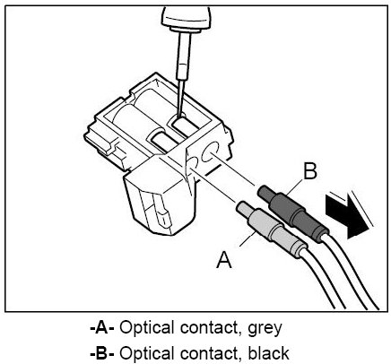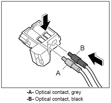 1. Push the optical contacts -B- and -A- into the module until they engage perceptibly. Check for proper seating of the optical contacts.