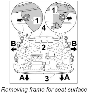 2. Unscrew fastening screws -2-, pull frame for seat surface -3- downwards -arrow A- and remove outwards -arrow B- from the seat frame -4-.