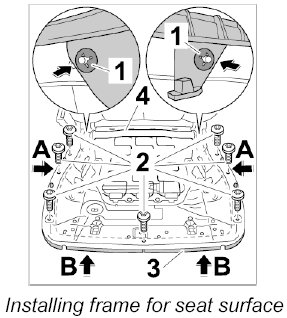 1. Position frame for seat surface -3- on the seat frame -4- ( -arrow A- ), press it upwards -arrow B- and screw down the fastening screws -2-.