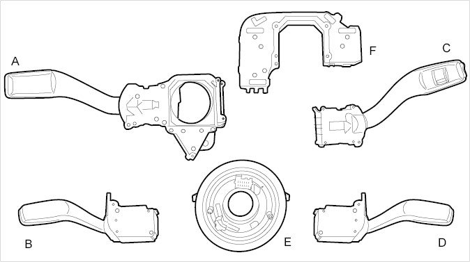 Replace the airbag contact unit (spring)/steering-angle sensor -E- and electronic unit -F-.