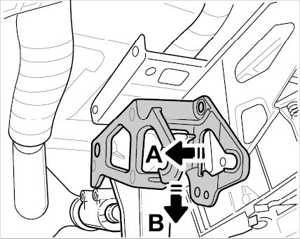 (Also remove clutch pedal switch and interlock switch, if necessary). Carefully move bracket for clutch power spring approximately 2-4 mm to the left -A-. Carefully turn bracket for clutch power spring clockwise by approximately 10-15 degrees on the pedal bearing axle -B-. Remove bracket for clutch power spring to the left.