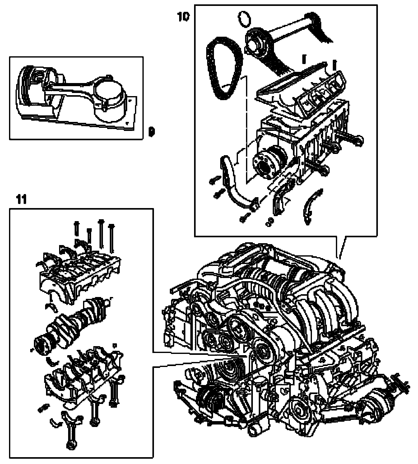 1. Fasten the engine support 9589 to the crankcase using special tool mounting elements 9590. Refit engine with support on the engine assembly support.