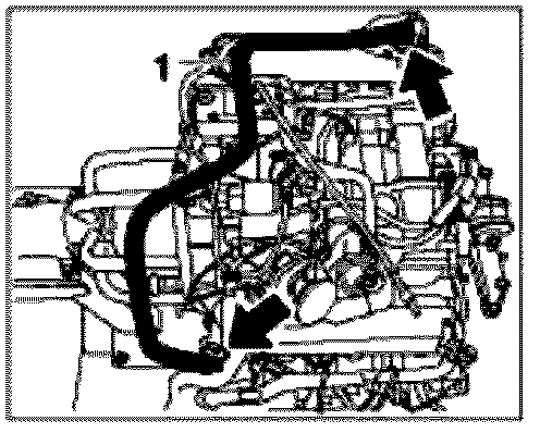 19. Remove the positive crankcase ventilation line -1 - by releasing and disconnecting the rapid-action couplings -arrows-. Replace O-rings during installation.
